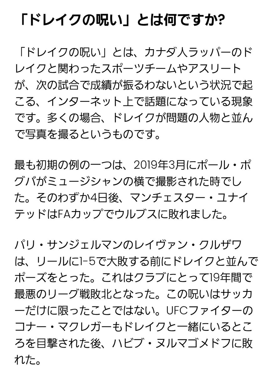 >ドレイクといえば、野球に限らず応援を受けたチームや、2ショットを撮影したアスリートに不幸が訪れるというジンクスがある。いつしか、「ドレイクの呪い」と呼ばれるようになった。