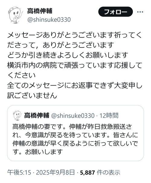 Xに「いつも伸輔を思ってくださっている皆様へ」と題した文書が掲載され、「伸輔が9/7に倒れてから今までについて報告します。2025年9月7日午後、不整脈が起こり心肺が停止しました。救急搬送され、その間もAEDで蘇生処置が行われましたが、正常な心臓のリズムが中々戻らず、脳に酸素が送られない時間が続いてしまいました」と高橋氏が9月7日に救急搬送されていたことを報告。