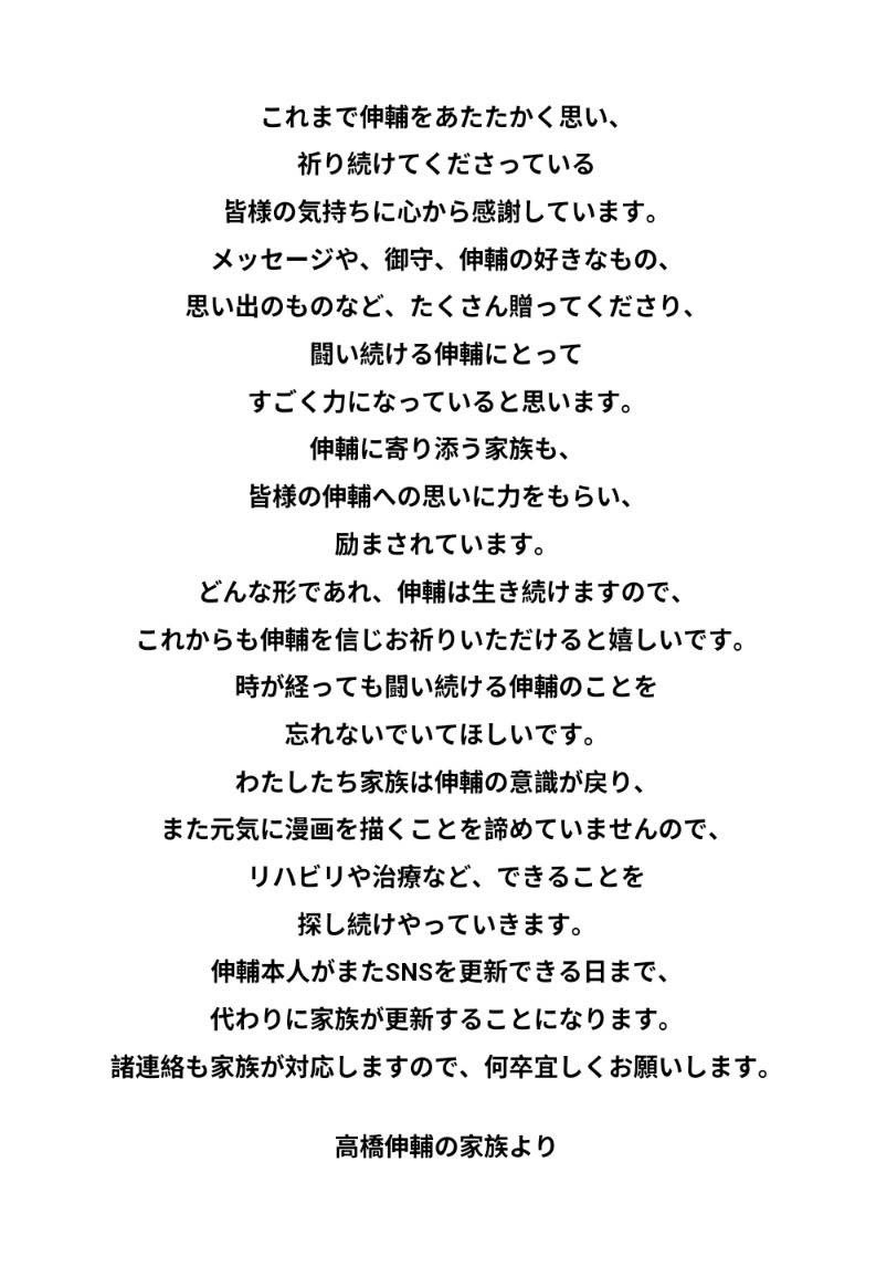 そして「わたしたち家族は伸輔の意識が戻り、また元気に漫画を描くことを諦めていませんので、リハビリや治療など、できることを探し続けやっていきます。伸輔本人がまたSNSを更新できる日まで、代わりに家族が更新することになります。諸連絡も家族が対応しますので、何卒宜しくお願いします 高橋伸輔の家族より」と呼びかけた。