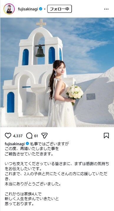 | “AI疑惑”で注目のシングルマザー・藤咲凪、再婚を報告 …シングルマザーであることを公表している元「最終未来少女」の藤咲凪(26)が7日、Xで、再婚したことを報告した。 純白のドレス姿でブーケを手にしたウェ… (出典:テレビ朝日系(ANN)) |