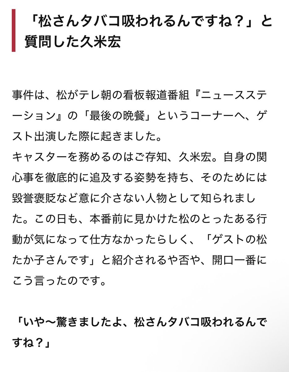 《久米宏さんといえばニュースステーションでゲストの松たか子に向かって突然喫煙者を暴露して清純派のイメージをぶっ壊したのが今も忘れられない》