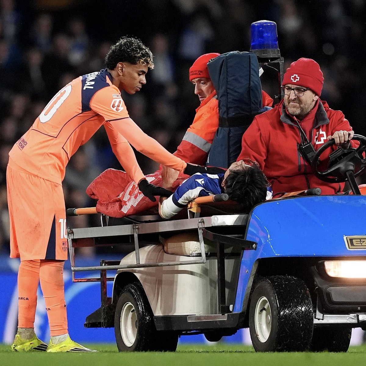 久保はというと積極的に後方まで戻って守備を行い、またカウンターの起点にもなっていたが、負傷でプレー続行不可能に。66分、前方に送られたボールを追いかけた際、左足ハムストリング辺りを押さえて、その場で仰向けに倒れ込んだ。微動だにしない久保はストレッチャーに乗せられて、観客からスタンディングオベーションを受けながらピッチを後にしている(代わりバレネチェアが出場)。