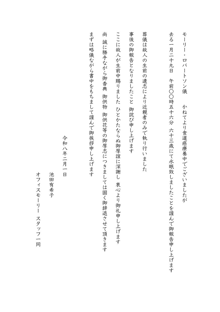 Xでは、パートナーの俳優・池田有希子、オフィスモーリー スタッフ一同による訃報を掲載。「モーリー・ロバートソン儀 かねてより食道癌療養中でございましたが 去る一月二十九日 午前○○時五十六分 六十三歳にて永眠致しましたことを謹んで御報告申し上げます」とし、「葬儀は故人の生前の遺志により近親者のみで執り行いました」と報告。「事後の御報告となりましたこと 御詫び申し上げます」とつづった。