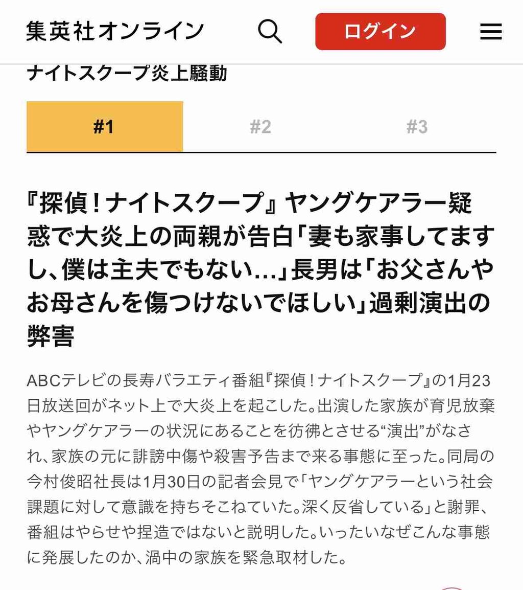 | 「探偵!ナイトスクープ」ヤングケアラー騒動で両親が声明「子どもたちの未来と尊厳を」/全文 ABCテレビ「探偵!ナイトスクープ」の1月23日放送が「ヤングケアラー」などと指摘され炎上騒動になった問題で、出演した家族の母親が5日、インスタグ… (出典:日刊スポーツ) |