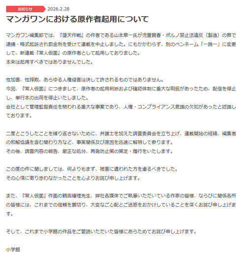 【小学館】マンガワン「常人仮面」の配信と出荷停止を報告 女子高生に性加害の原作者『堕天作戦』山本章一氏を別名で連載起用★4