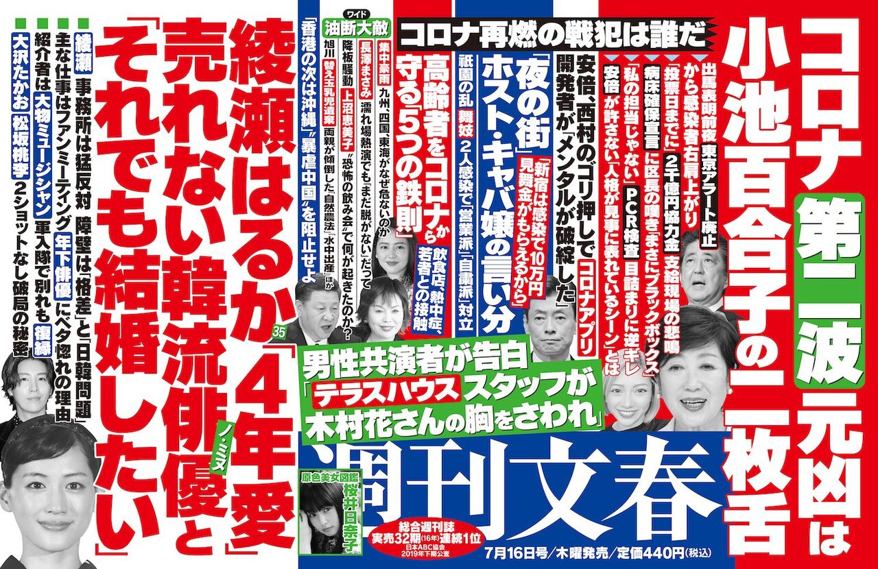 【週刊文春】綾瀬はるか 35歳「4年愛」 売れない韓流俳優ノ・ミヌと熱愛! 事務所は猛反対するものの「それでも結婚したい」 二人を引き合わせたのは大物ミュージシャン