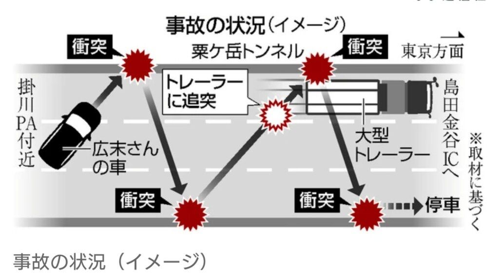 俳優の広末涼子さん(44)が静岡県掛川市内の新東名高速道路で車を運転中、大型トレーラーに追突した事故で、車が追突の前後に2度ずつ、車線を横断するように側壁に衝突していたとみられることが3日、捜査関係者への取材で分かった。