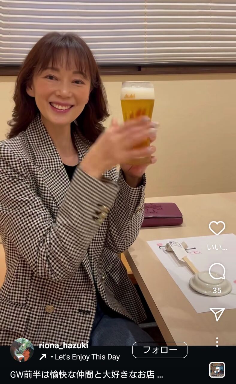 葉月里緒奈49歳、ぜんぜん変わらぬ美しさ...ビール片手に笑顔で乾杯 「ほんとお綺麗」「素敵な笑顔」