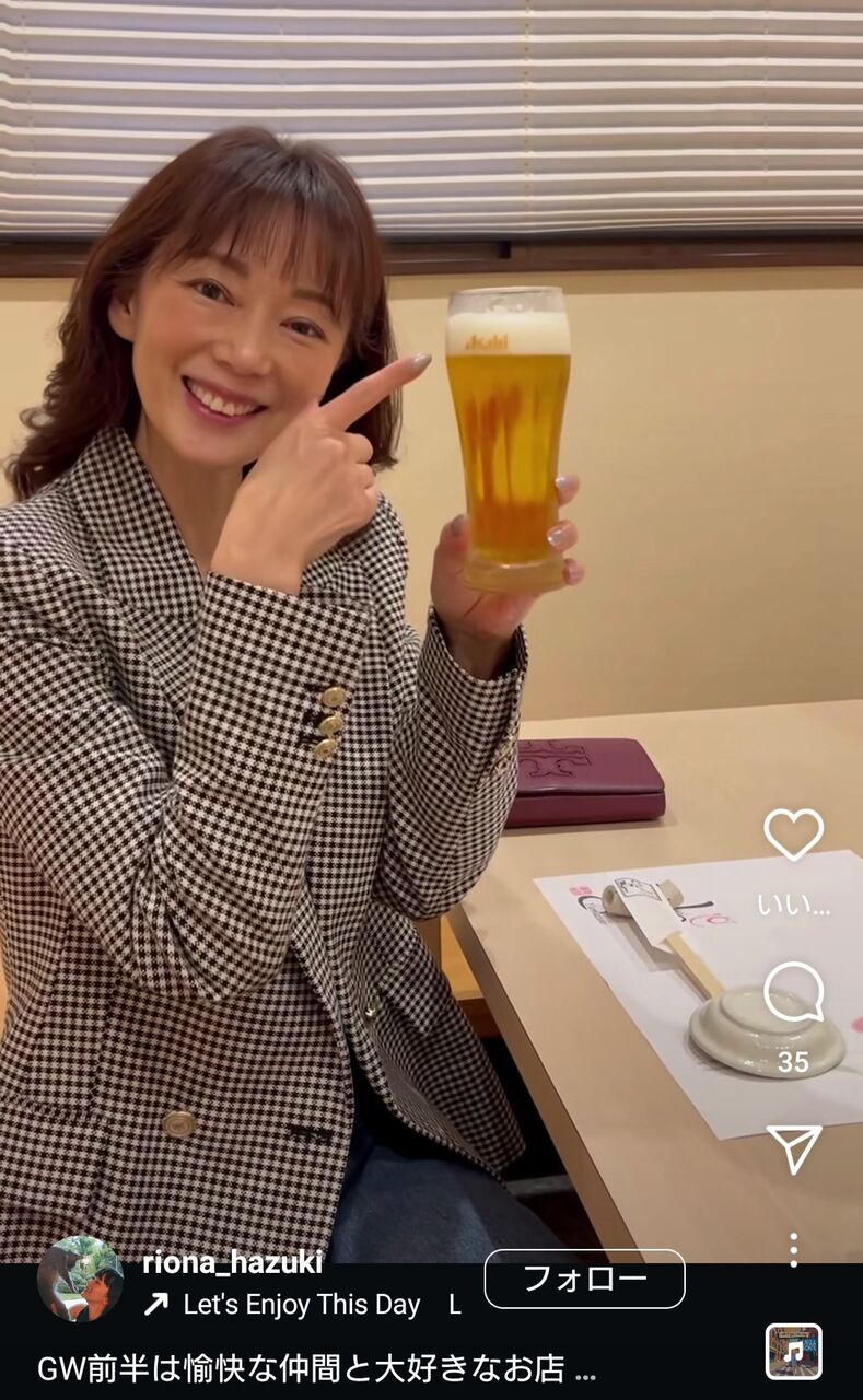 インスタグラムに投稿された写真では、チェック柄のジャケット、黒のトップス、ブルーのパンツを着用。左手でビールグラスを持ち、笑顔でカメラに向かって手を振っていた。