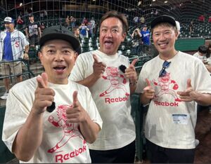 試合前練習時にはたむらけんじとともにグラウンドに登場。