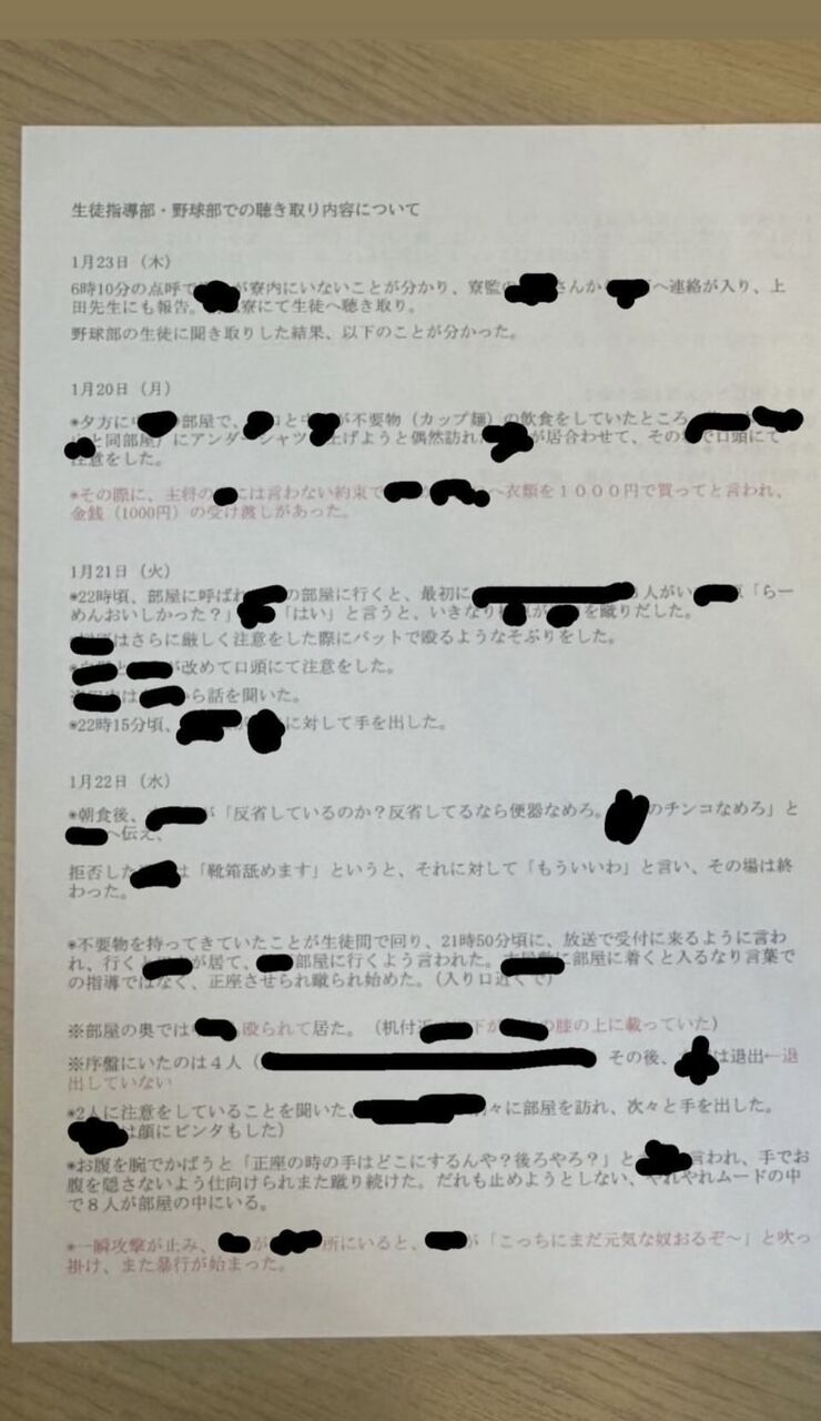 広陵高校野球部いじめ事案(2025年1月20日~22日)概要 1月20日(月) 被害者BとAがBの部屋でカップ麺を食べ、加害者1が注意し、Bに1,000円で衣類購入を依頼(口止め料の可能性)。 1月21日(火) 夜、加害者3がBを蹴り、バットで威嚇。加者1が口頭注意、加者5が暴行。 1月22日(水) 朝、加害者5がBに「便器や*を舐めろ」と要求。 Bが拒否し靴箱を舐めると申し出で終了する… 夜、加害者5の部屋でBが正座させられ蹴られる。 Aも暴行被害。 加害者6、7、5、8、4が暴行 (4はビンタ)。主将9と加害者1がBを連れ出し、9がビンタと蹴り。1は 暴行不参加。 加害者9人の行為 ・暴行:3、5、7、8 ・ 暴行+ビンタ:4、9 ・暴行なし:1、6、10 発覚経緯 1月23日、寮点呼で部員不在が発覚し、寮監が報告。 被害者保護者からの情報提供で事案が判明。
