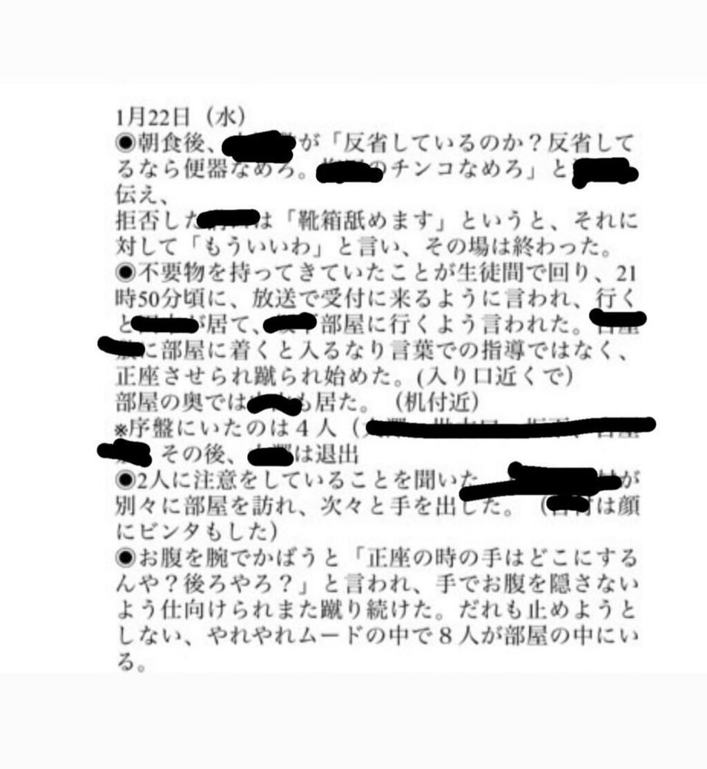 >加害者5がBに「便器や*を舐めろ」と要求。 Bが拒否し靴箱を舐めると申し出で終了する…