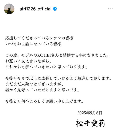 松井は「皆様にご報告です」として文書の画像を投稿。文書には「応援してくださっているファンの皆様 いつもお世話になっている皆様」とし「この度、モデルのKOHEIさんと結婚する事となりました」と発表した。